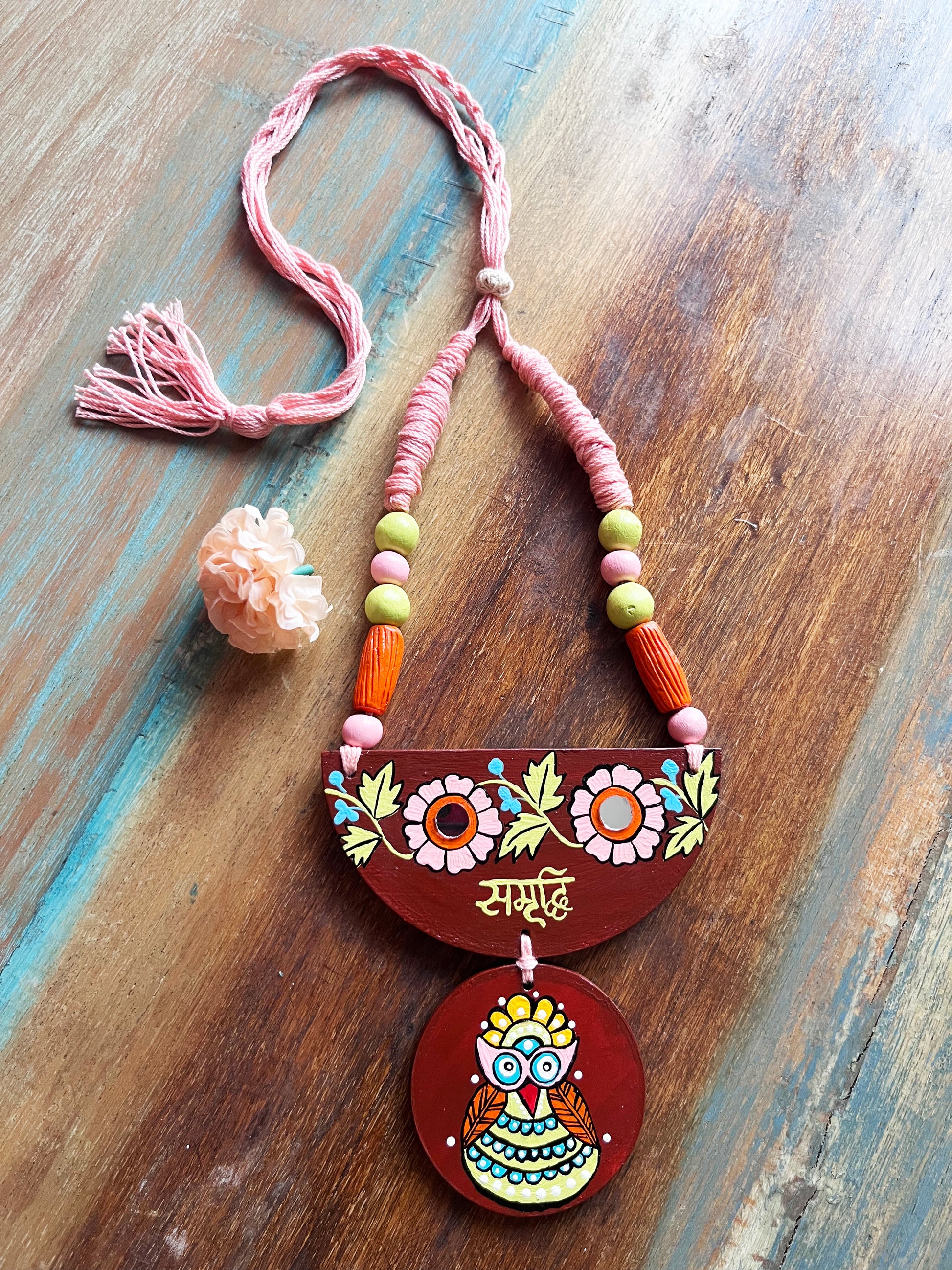Hand-Painted Owl Necklace with "Samrudhi" Inscription